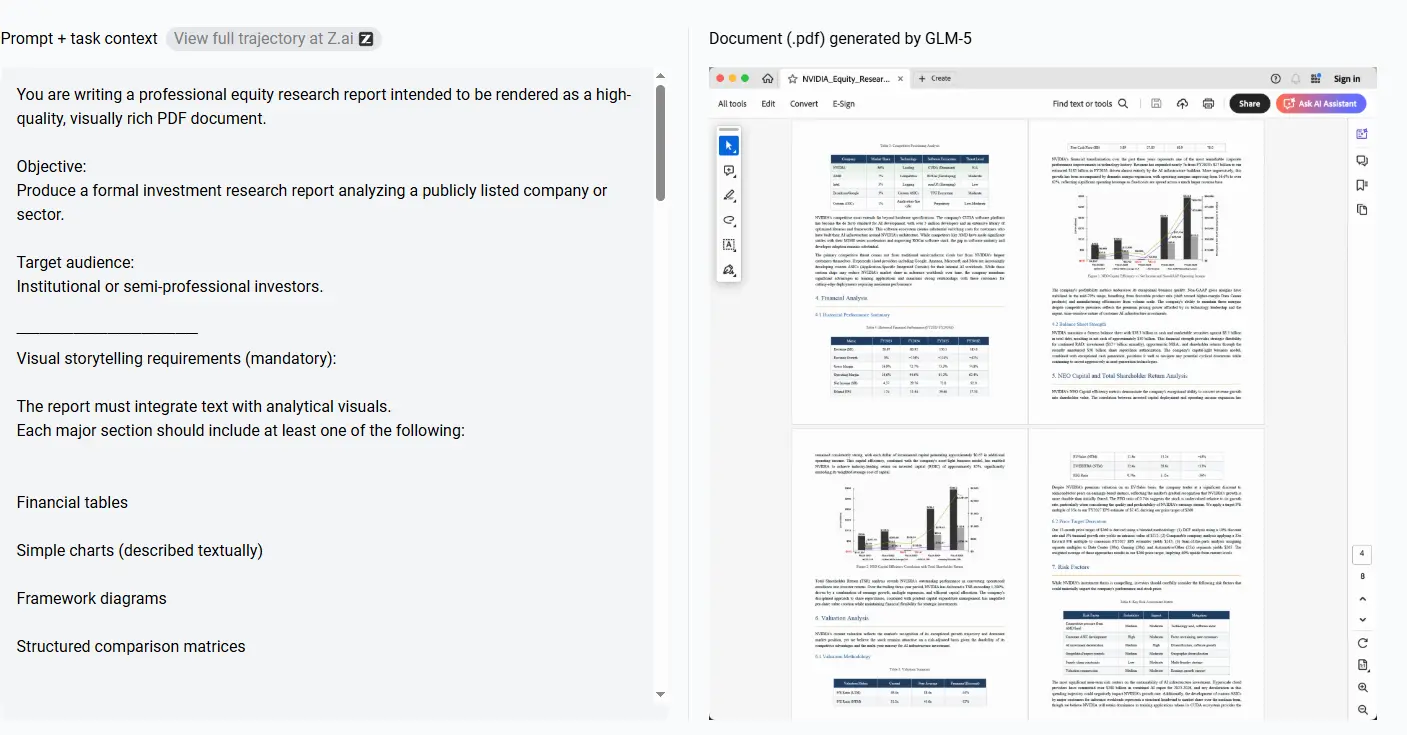 - With GLM-5 on Siray.AI: You give the high-level instruction. GLM-5’s agentic capabilities allow it to browse, read, filter, and synthesize the information over many steps, eventually producing a Word-document-ready report.
